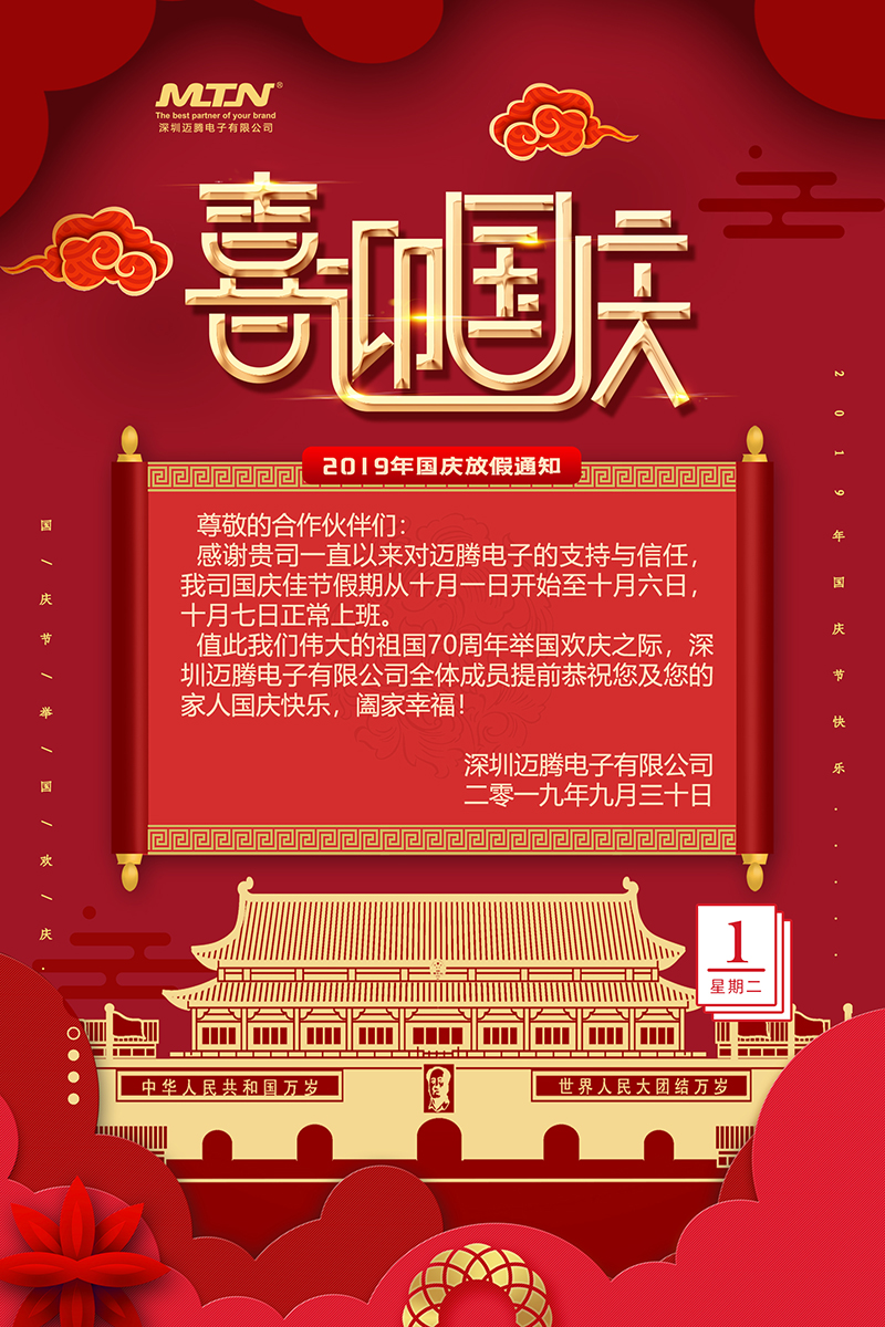 2019年邁騰電子國慶節放假通知。